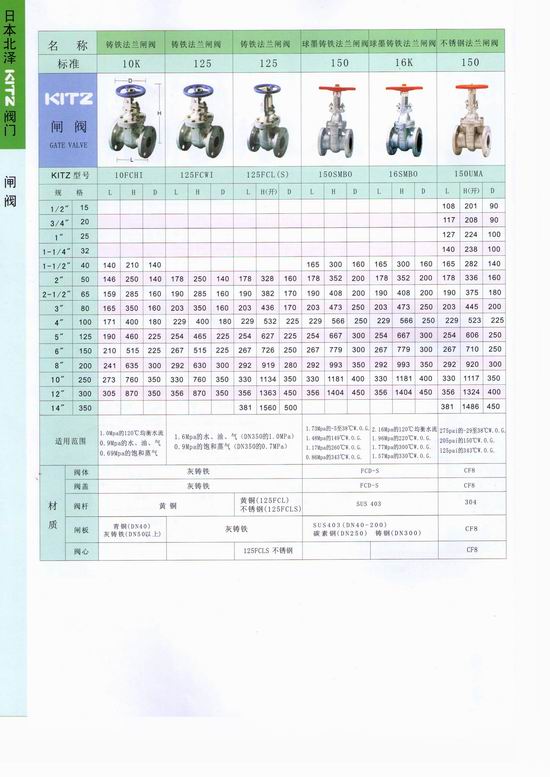 日本北澤KITZ鑄鐵法蘭閘閥:閘閥的啟閉件是閘板,閘板的運動方向與流體方向相垂直,閘閥只能作全開和全關(guān) , 不能作調(diào)節(jié)和節(jié)流。閘板有兩個密封面 , 常用的模式閘板閥的兩個密封面形成楔形、楔形角隨閥門參數(shù)而異 , 通常為 50, 介質(zhì)溫度不高時為 2°52' 。