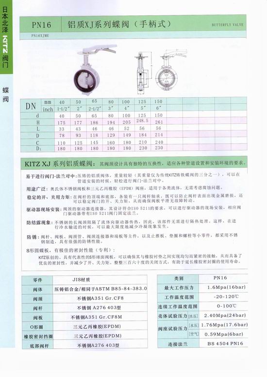 日本北澤KITZ蝶閥蝶閥不僅結構簡單、體積小、重量輕、材料耗用省,安裝尺寸小,而且驅(qū)動力矩小,操作簡便、迅速,并且還同時具有良好的流量調(diào)節(jié)功能和關閉密封特性,在大中口徑、中低壓力的使用領域,蝶閥是主導的閥門形式。手柄式 型號:PN16DJ (球墨鑄鐵蝶板) 蝸輪式 :G-PN16DJ (球墨鑄鐵蝶板) PN16DJU (不銹鋼蝶板) G-PN16DJU (不銹鋼蝶板)