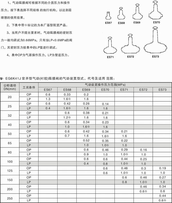 氣動隔膜閥可根據(jù)不同的介質(zhì)壓力和操作壓力,選擇不同的執(zhí)行機構(gòu),以達到理想的使用效果。英標常開式氣動隔膜閥(EG6K41J)注意事項(安裝前請仔細閱讀本公司提供的說明書): (1)、由于隔膜為易損件,應視介質(zhì)特性而定期更換。 (2)、受隔膜材料限制,隔膜閥適用于低壓和溫度相對不高的場合。 (3)、一般不宜用于溫度高于60度及輸送有機溶劑和強氧化介質(zhì)的管路中,也不宜在較高壓力的管路中使用。