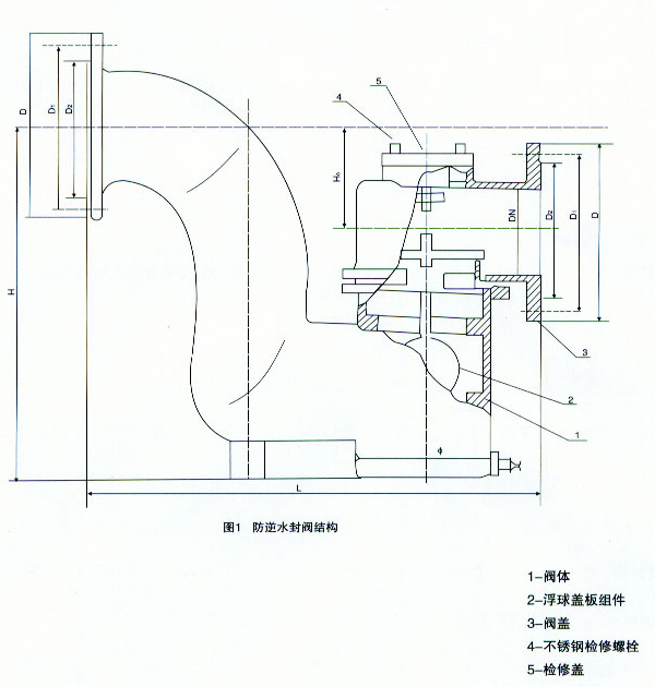 F43X-1.0T防逆水封閥主要由帶存水彎的閥體及浮球蓋板組件等組成,帶浮球的蓋板蓋在閥體的密封閥座上,將閥腔分成內(nèi)外兩部分,內(nèi)腔為清水部分,外腔通排水管道,當(dāng)內(nèi)腔充滿清水時.因位于內(nèi)腔的浮球作用,蓋板壓力降低,易于開啟通流。溢流停止后,蓋板可自行復(fù)位.蓋嚴(yán)閥座,從而可嚴(yán)格阻斷臭氣及污水倒灌。如果水池進(jìn)水口浮球閥關(guān)閉良好,數(shù)年不溢流,閥腔無水,浮球可加重蓋板重量,更好地蓋嚴(yán)閥座,同樣可嚴(yán)格阻隔臭氣及防止雨、污水倒灌清水池。如果污水進(jìn)入閥體外腔,所帶雜物僅能粘附在蓋板外表面,不影響蓋板封嚴(yán)閥座。故該防逆水閥工作可靠,效果好,不易出故障。且當(dāng)有雜物沉淀時.下次溢流時可自動沖出閥體。