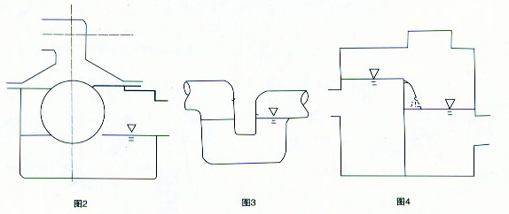 1、本防逆水封閥裝于清水池溢流管上,以前的防逆水封閥(圖2)及存水彎(圖3)或溢流井(圖4)在閥內(nèi)無水時,均不能阻隔臭氣進(jìn)入清水池,而當(dāng)清水池進(jìn)口浮球鞋閥很好時,尤其是新建水池,往往很少溢流甚至數(shù)年無溢流,因而,上述三種裝置均不能防止下水道臭氣進(jìn)入清水池,而本防逆水封閥的蓋板浮球結(jié)構(gòu)則可無論是否有水均可阻隔臭氣,保持清水池良好的衛(wèi)生狀況。