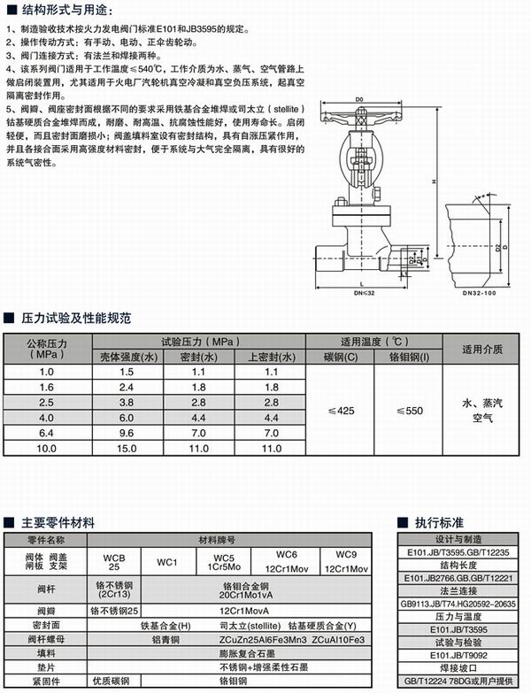 NKJ41H焊接式真空隔離截止閥采用主體鑄鍛結(jié)構(gòu),具有平行雙密封副半強制雙向密封,密封面到位運動和楔形塊楔緊運動分步作用實現(xiàn)零泄漏。真空隔離截止閥適用于公稱壓力PN4.0~10.0Mpa,工作溫度≤200℃的火力電站回水冷凝系統(tǒng)管道上,切斷或接通中的介質(zhì)。適用介質(zhì)為:水、蒸汽等。密封面運動磨擦力小、啟閉輕便,而且密封面磨損有自動補償功能。結(jié)構(gòu)簡單、緊湊、檢修方便,使用壽命長。閥蓋填料室設有真空密封結(jié)構(gòu),具有自脹壓緊作用,并且密封采用高強膨脹材料密封,使系統(tǒng)與大氣完全隔離,具有很好的系統(tǒng)氣密性。真空隔離截止閥連接形式分法蘭、焊接兩種,驅(qū)動方式有手動、電動兩種。真空隔離截止閥適用于工作溫度≤425℃和≤550℃,工作介質(zhì)為水、蒸汽或空氣的管路上,作為啟閉裝置;真空隔離截止閥尤其適用于火電廠汽機冷凝和真空負壓系統(tǒng),起真空隔離密封作用。